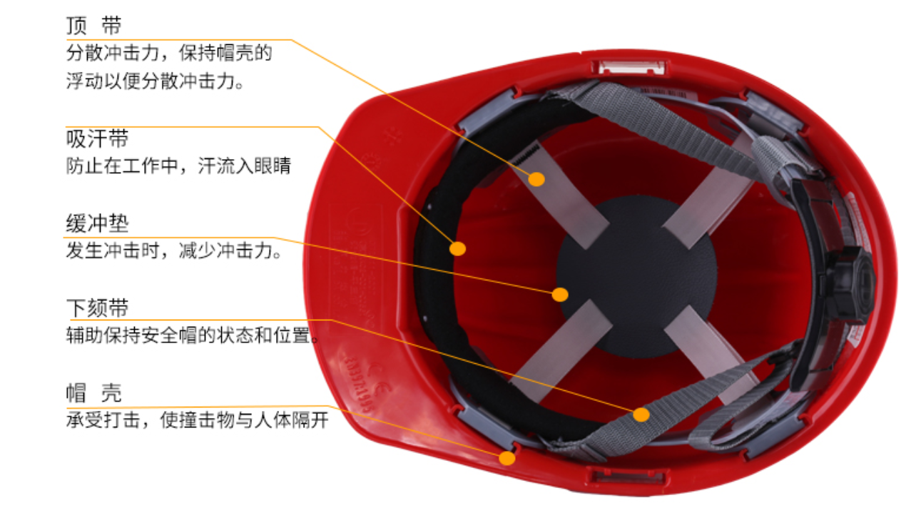 进口ABS高抗冲工程塑料,六点式织带,帽衬有插接、一指键、旋钮。 颜色可选:红、黄、蓝、白、橘红。产品标准符合:GB2811-2019